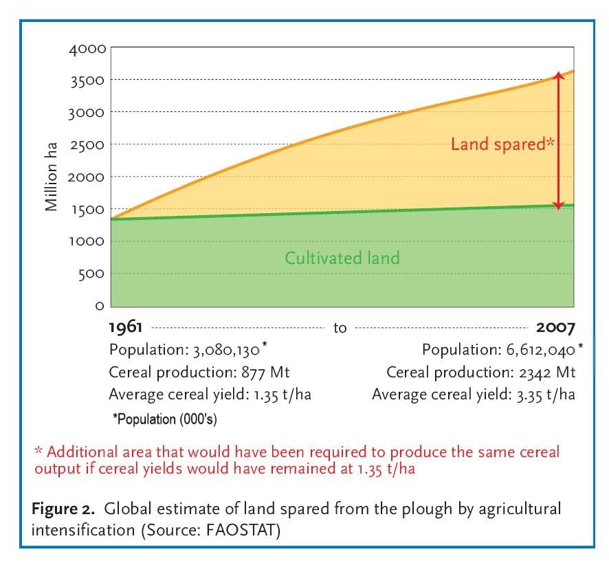 The graph plots the increase in cultivated land from 1961 to 2007 (green line). Whilst the increase is less than 20%, in the same period yields have increased from 1.35t/ha to 3.35t/ha or 250%. Over the same period the population has more than doubled, from 3 billion to 6.6 billion. The increase in crop yield has allowed us to feed a much larger population without taking more land into agricultural production.