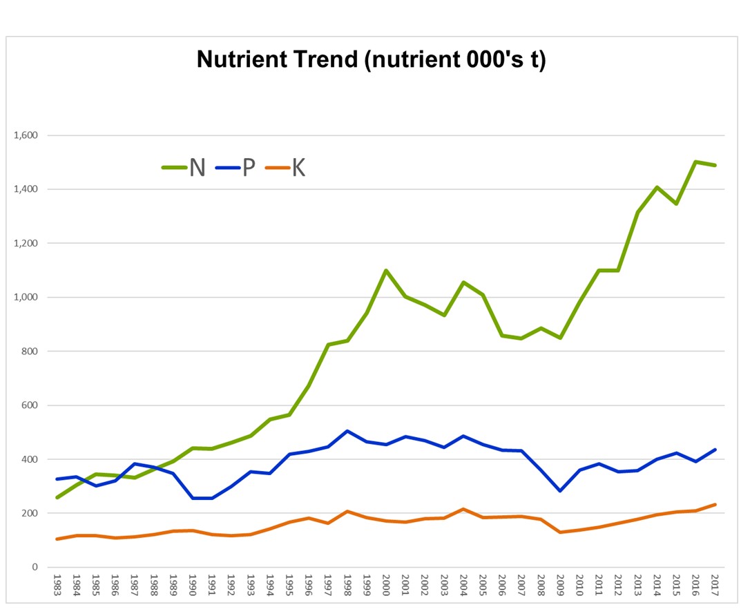 The graph plots the tonnes of three major nutrients, Nitrogen (N), Phosphorus (P) and Potassium (K) supplied as fertilizer in Australia from 1983 to 2017. In product terms, this has averaged just over 5.4 million tonnes per annum between 2002 and 2017.