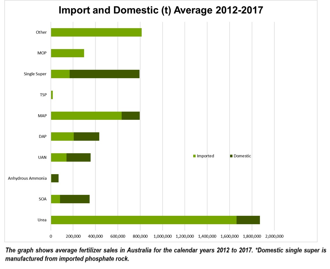 From 2002 to 2017 average annual sales of fertilizer in Australia are 5.4 million tonnes. This provides around 1,000,000 tonnes of nitrogen, 400,000 tonnes of phosphorus and 200.000 tonnes of potassium. About half of this is manufactured in Australia, including superphosphate, which is manufactured from imported phosphate rock. For more on what is fertilizer, read our quick fact sheet.