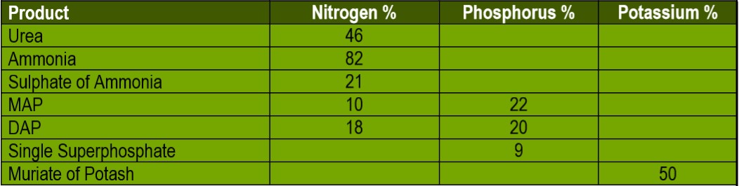 As an example, urea is a nitrogen fertilizer that contains 46% nitrogen thus a tonne of urea contains 460Kg of nitrogen. Major fertilizers and their typical analysis are listed in the table below.